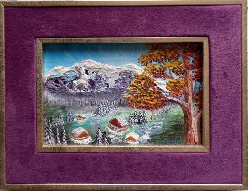 Paysage de neige: Les chalets savoyards".Miniature.Huile sur bois.10x15cm