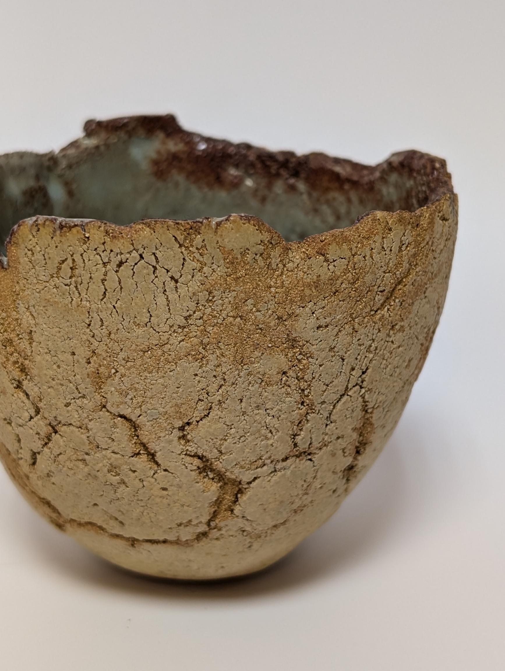 pièce en grès. Pour cette pièce j'ai supperposé un grès blanc sur un grès roux et créé des fissussures sur la surface extérieur. L'intérieur est émaillé en bleu celadon.