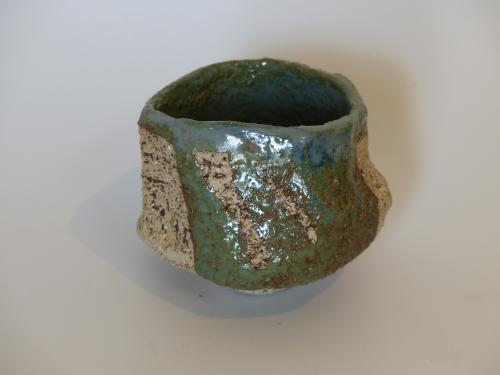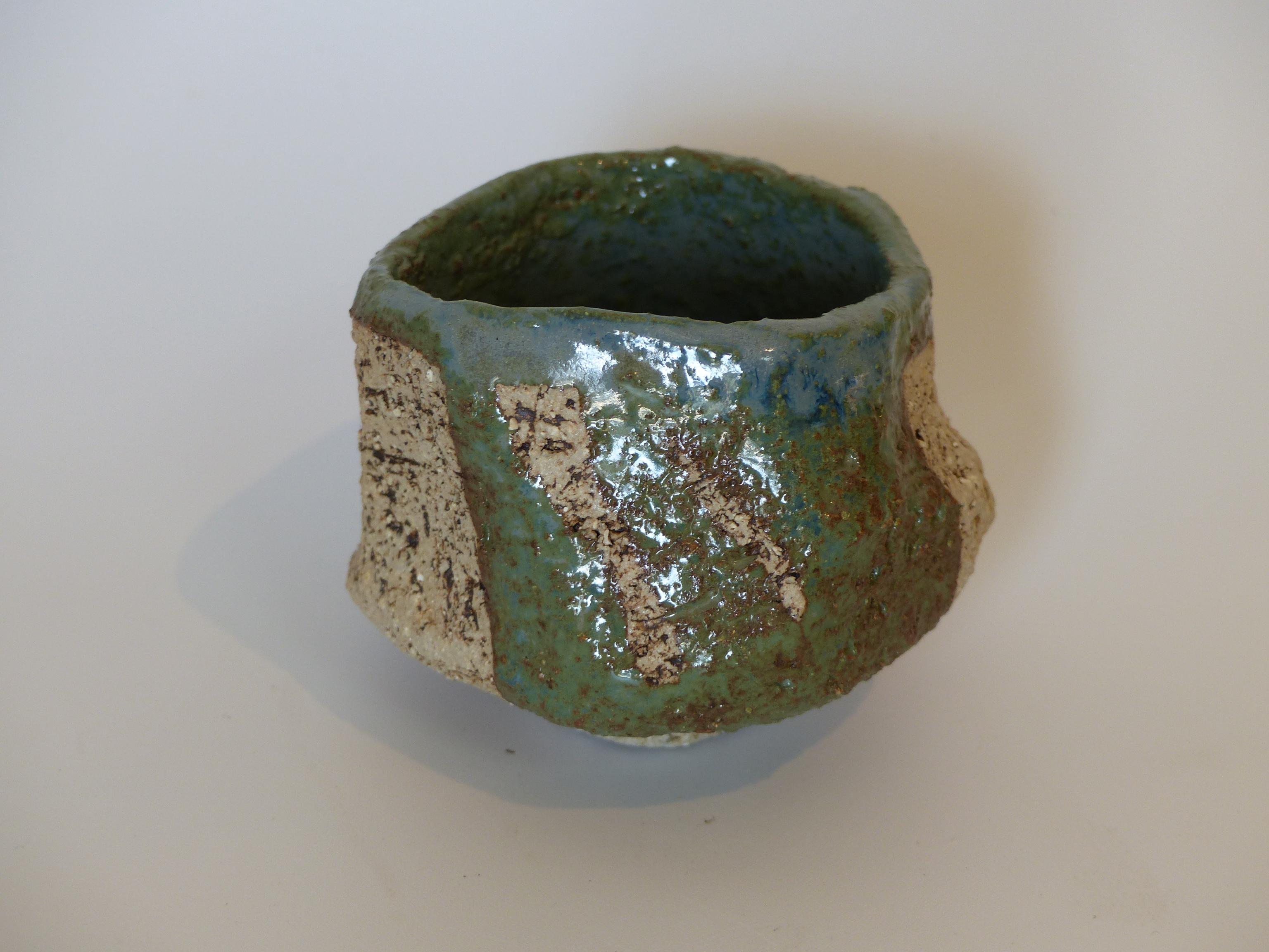 A VENDRE: 45€. Pièce en grès brut, façonnée dans la masse avec la technique du Kurinuki. L'intérieur est émaillé dans des tons verts-bleus.