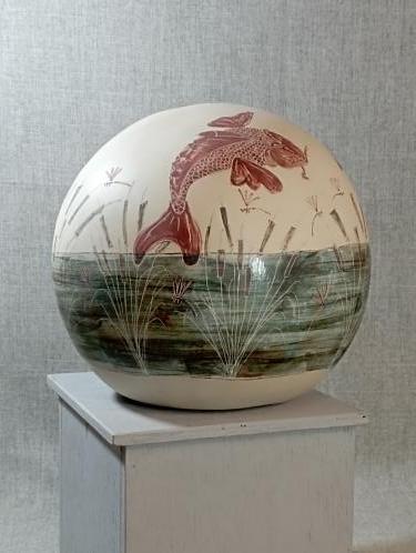 Pièce décorative en grès blanc. Le décor est peint à la main avec des engobes et sgraffité, pour donner du relief et faire ressortir les détails.