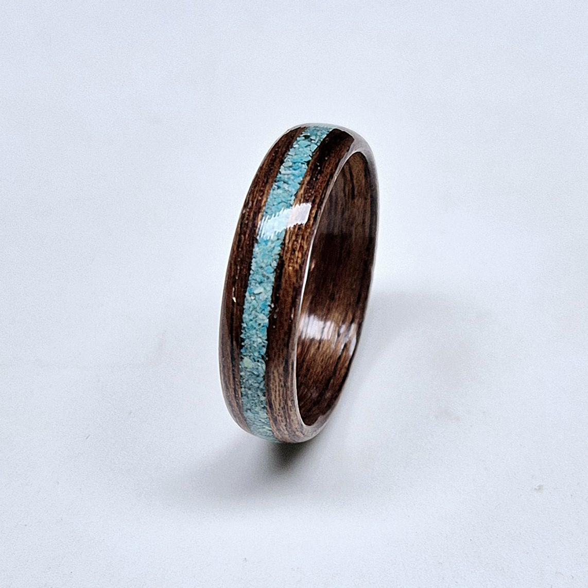 A VENDRE: 79€. Bague ou alliance en Acajou avec incrustations de fragments de pierre de Turquoise.