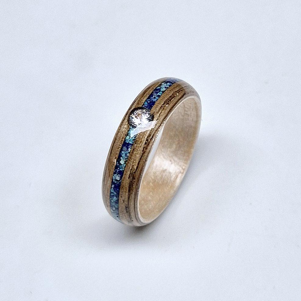 Bague en bois de Sycomore(intérieur) et chêne(extérieur) incrustée d'un liseret de fragments de pierre de turquoise et Lapis-lazuli. et ornée d'une pierre de Zirconium 3 mm.