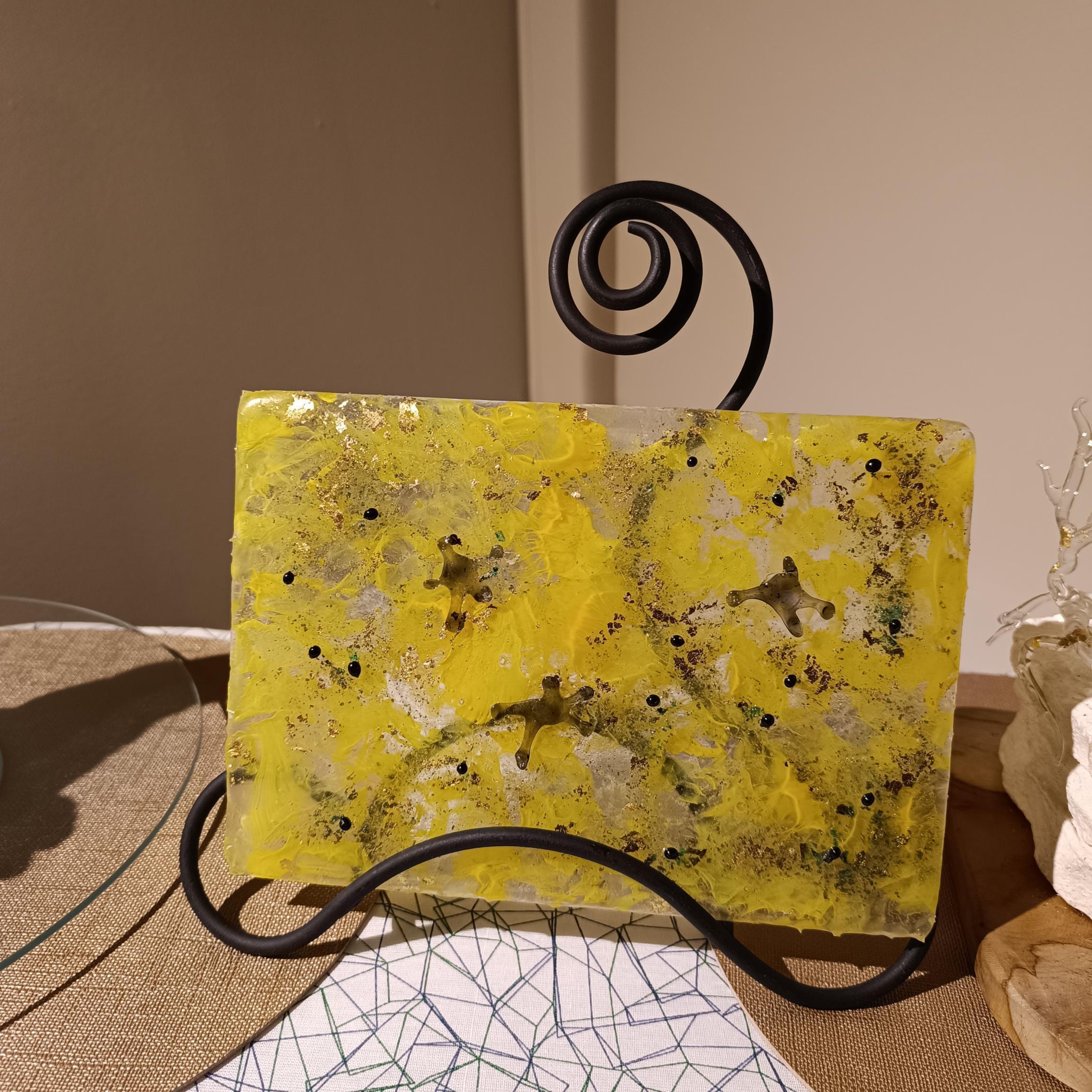 Plaque fusion moucheté jaune - filage de verre splashs et billes noirs - application feuille dorée sur support métal noir