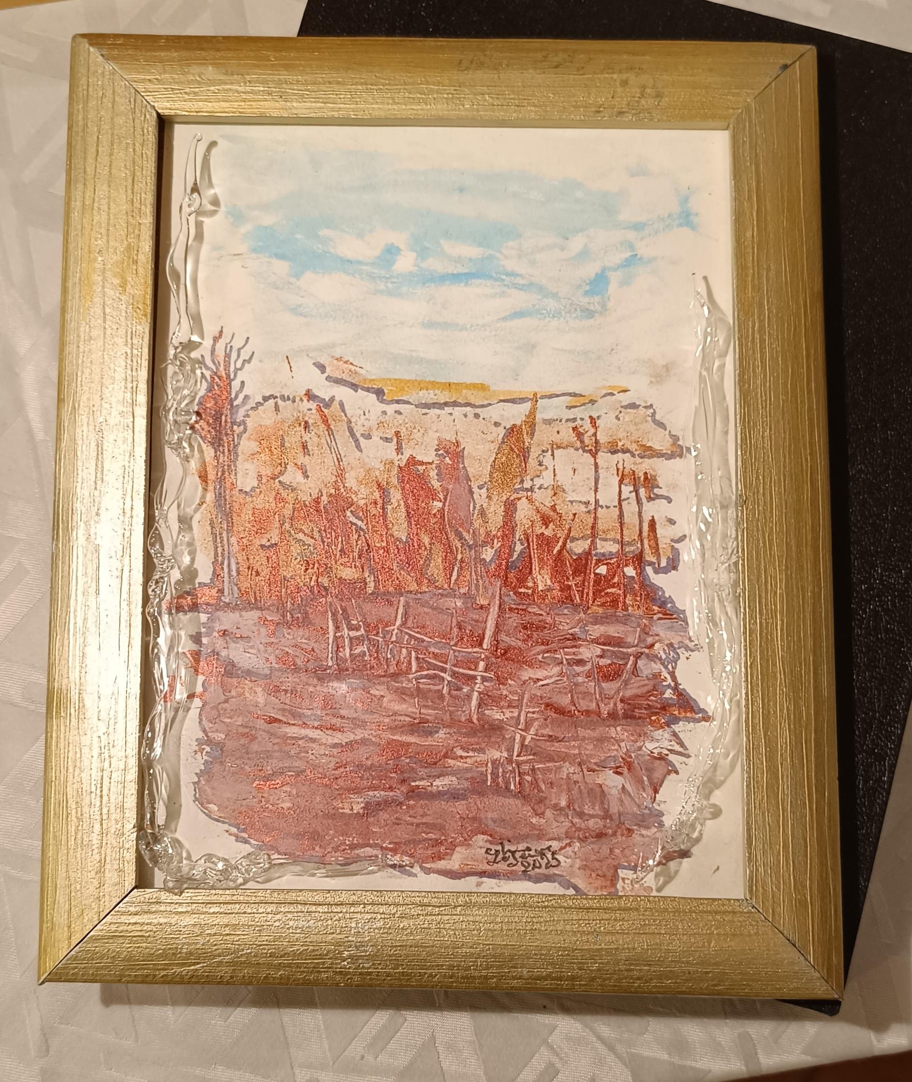 Peinture acrylique et gouache au couteau . Branchages verre recyclé soufflé . Cadre doré . 19x24 cm