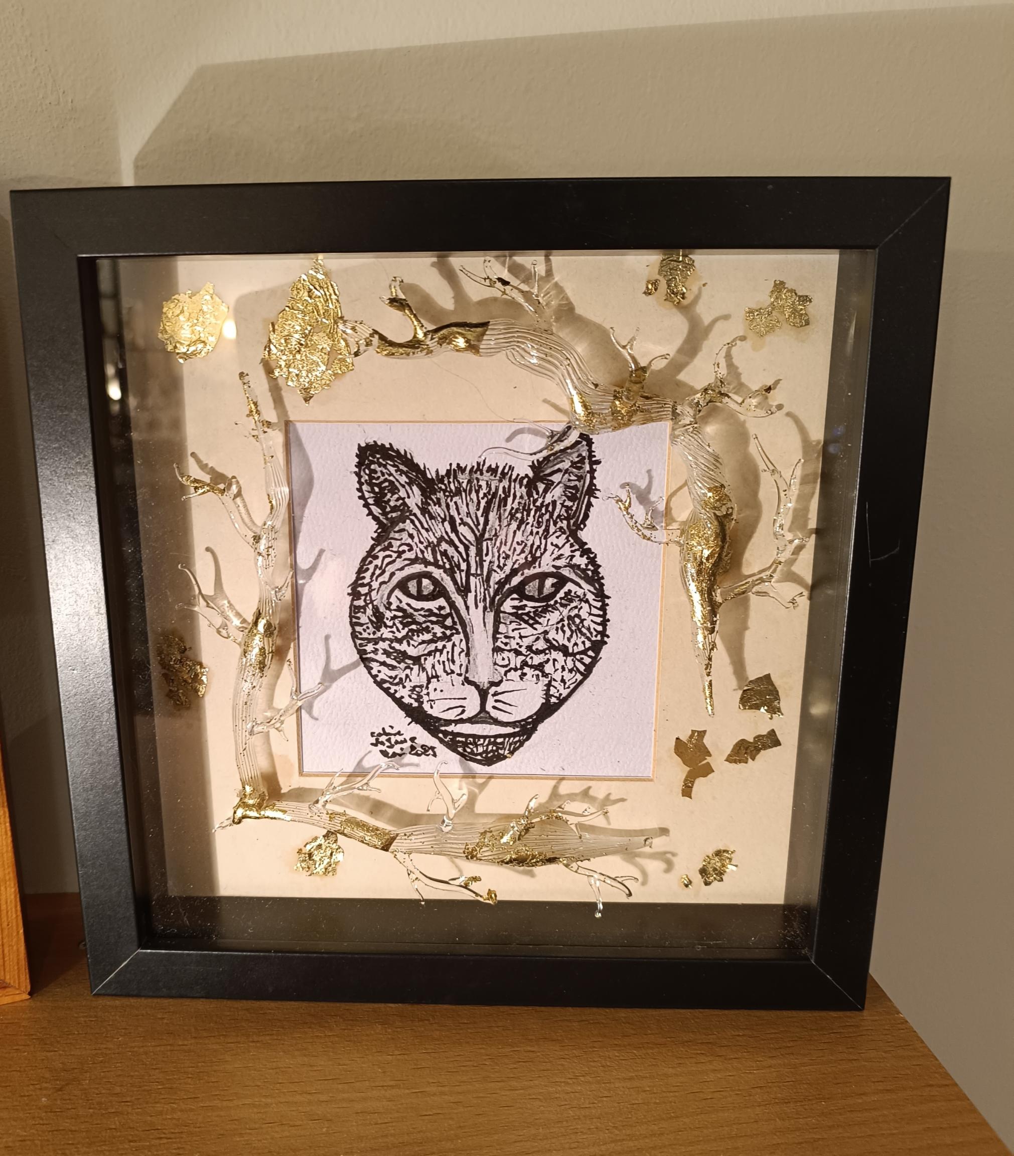 Dessin de félin noir et blanc . Verre recyclé soufflé . Application feuilles dorées .
