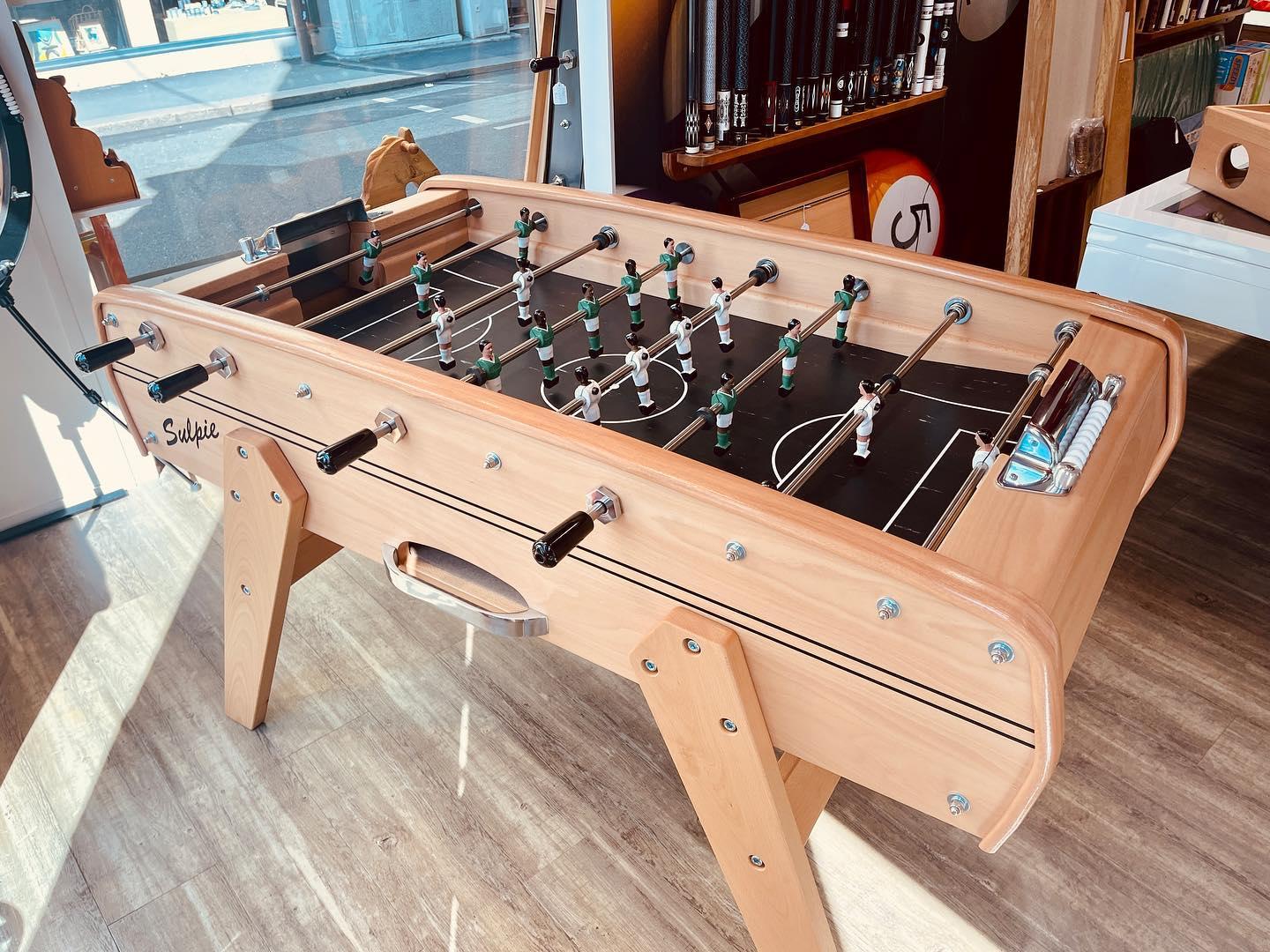 Chaque table est conçue en bois massif — hêtre ou chêne — avec des barres en acier inoxydable et des joueurs en aluminium vissés. Sulpie est l'un des derniers fabricants français de baby-foot haut de gamme en bois massif, et continue d'innover avec de nouveaux matériaux comme le polyéthylène recyclable pour sa gamme outdoor.