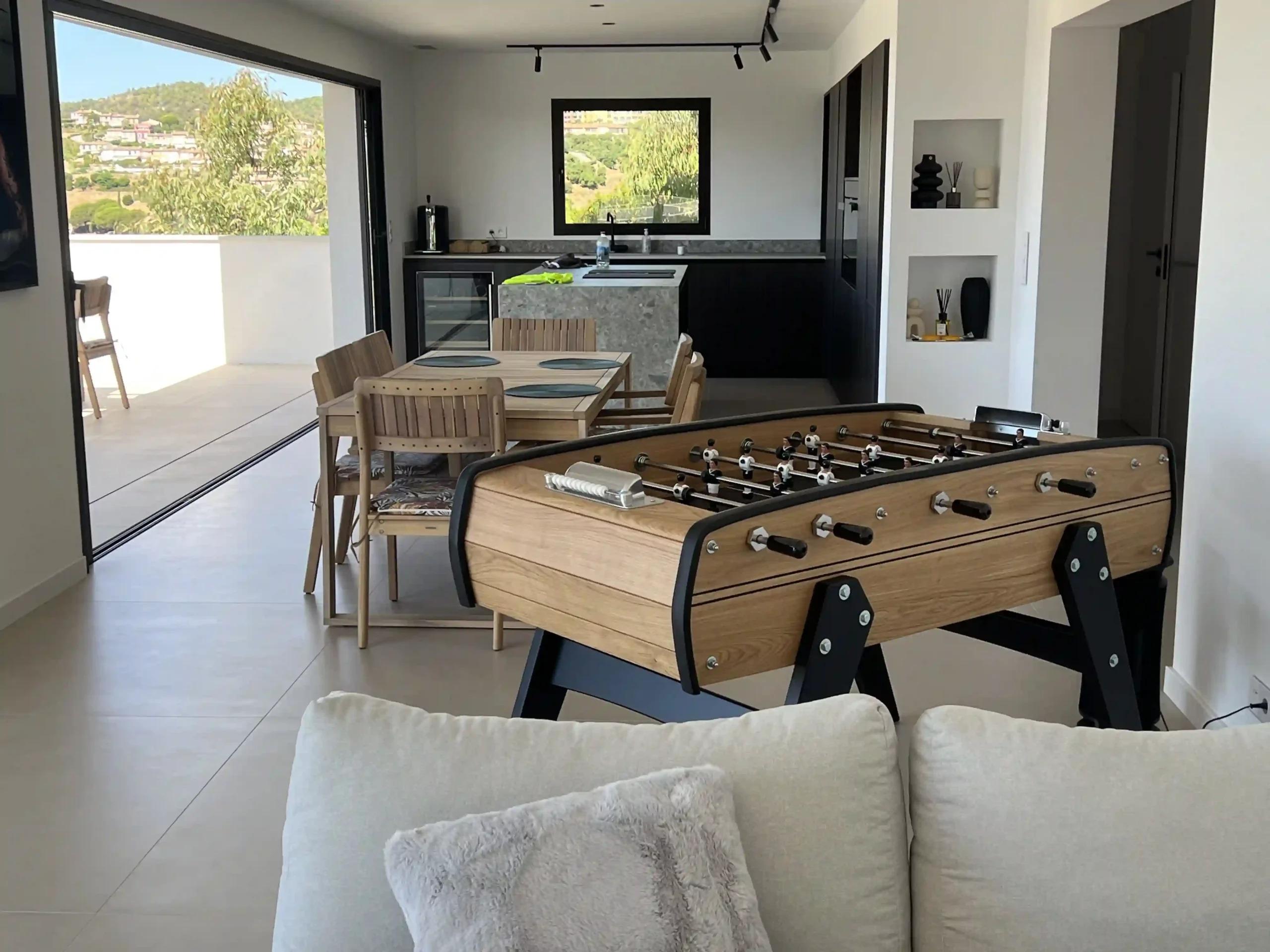 Baby-foot Sulpie en chêne naturel dans un salon contemporain. Le bois massif apporte chaleur et authenticité à un intérieur aux lignes modernes.