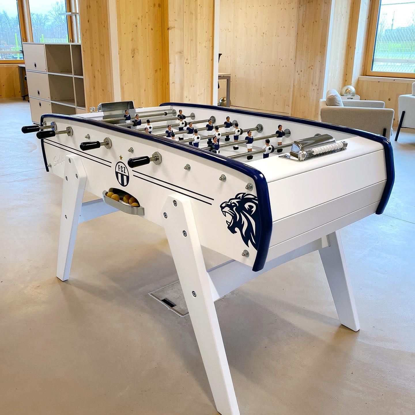 Baby-foot Sulpie laqué blanc, personnalisé aux couleurs d'une marque. Caisse monochrome, joueurs assortis — une réalisation sur mesure livrée clé en main.