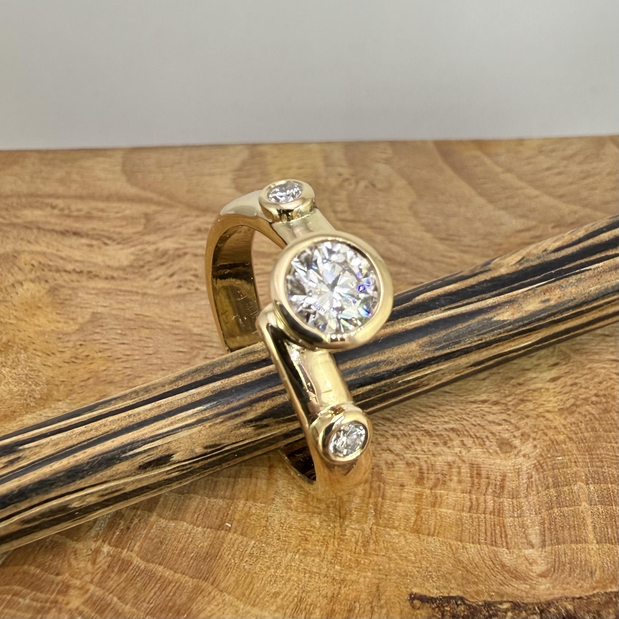 Réalisation "sur mesure" d'une bague en or et diamants de synthèse. Or fourni par ma cliente. Auelle belle manière de perpétuer un héritage familial et de faire du bien à la planète en recyclant l'or (évitant ainsi l'utilisation de produits chimiques pour son retraitement ou sa production en milieu naturel)