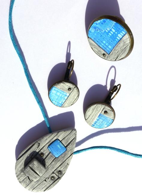 Ensemble "bord de mer" imitation "bois gris" appris en stage avec Hélène JeanClaude montage pendentif / fermoir enseigné aux JAFA 2016