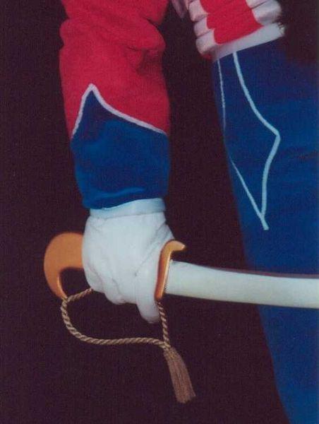 détail du soldat au sabre, gant en cuir, costume en panne de velours