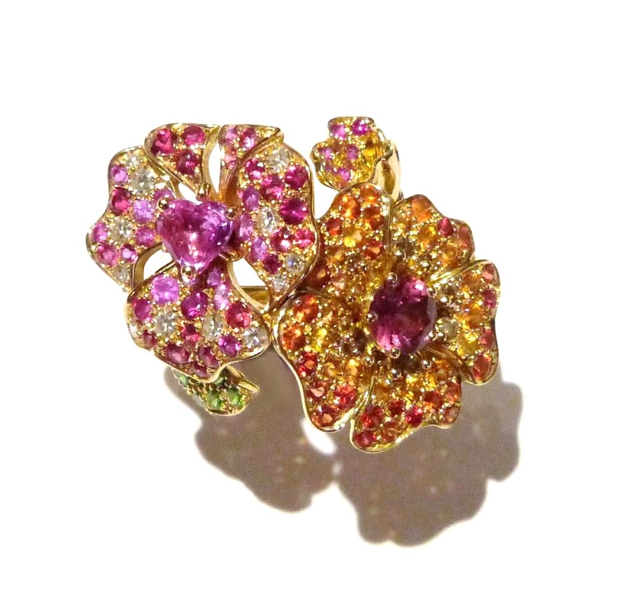 Fleurs de Sophie: Edition limitée à 12 exemplaires. Or jaune, saphirs de couleurs, diamants cognac, diamants blanc et grenats tsavorite