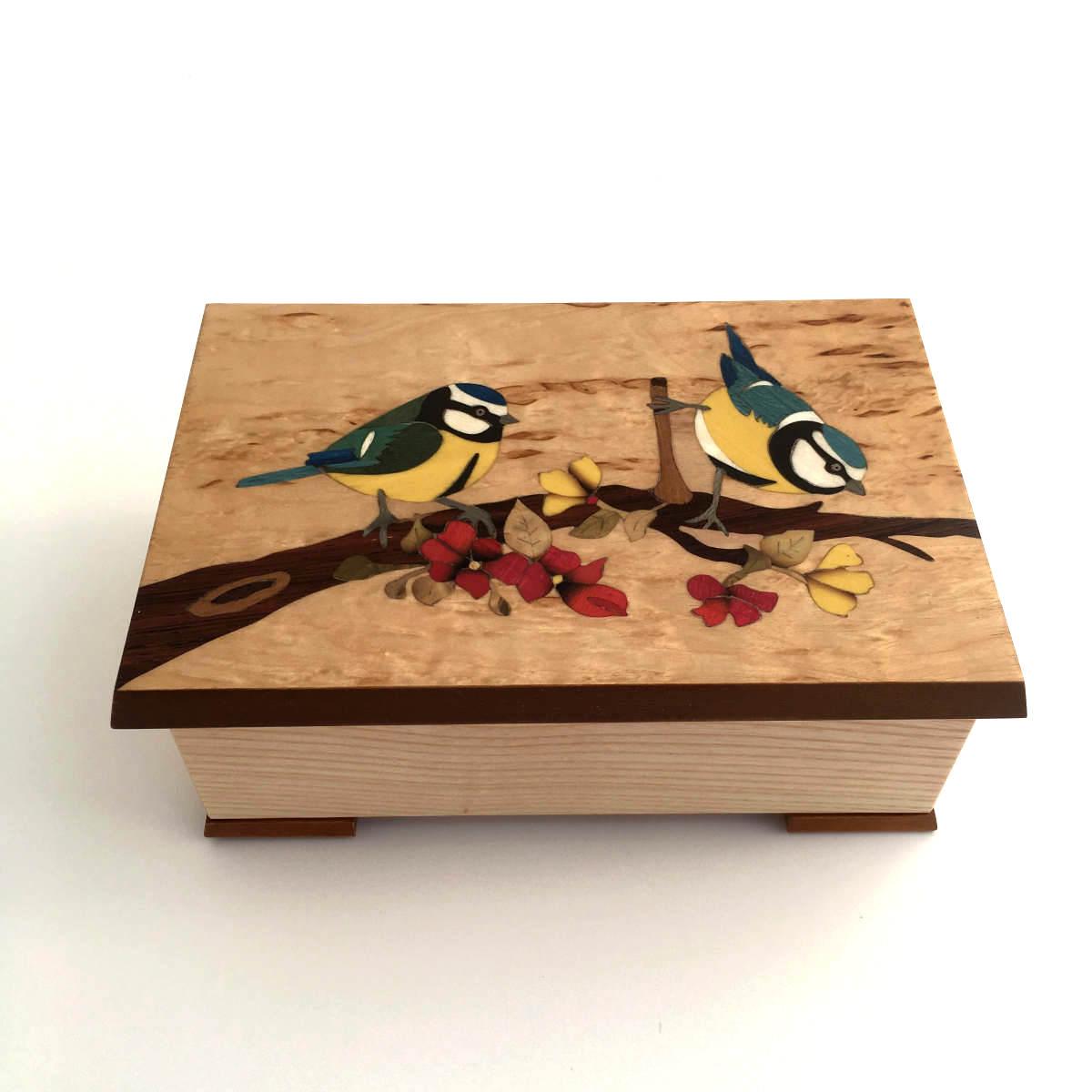 Boîte à musique ou coffret à bijoux en marqueterie "mésanges"