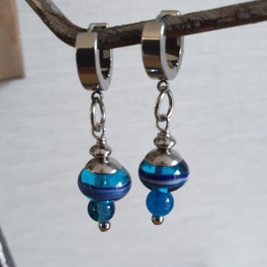 Boucles d'oreilles en verre de Murano turquoise et agates, sur petites créoles en acier inoxydable