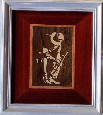 La virtuose : Tableau en marqueterie format 43x35 , essences naturelles