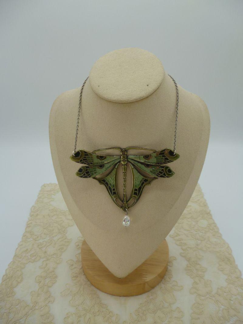 Libellule esprit Art Nouveau, dans des tons de verts, base laiton sans nickel. Libellule, chaîne, passées dans des bains d'argenture. Perle de cristal.